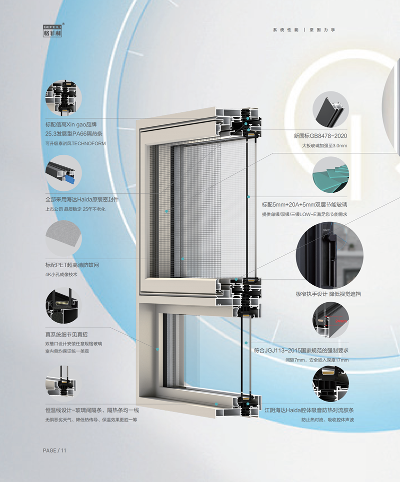 極影系列分為G111、G120系列。型材壁厚涵蓋1.8-3.0可自由組合搭配。極影系列設(shè)計(jì)初衷為高性能、高顏值、窗扇采光較傳統(tǒng)門窗提升20%。五金采用內(nèi)外雙槽設(shè)計(jì)更加穩(wěn)定耐用!